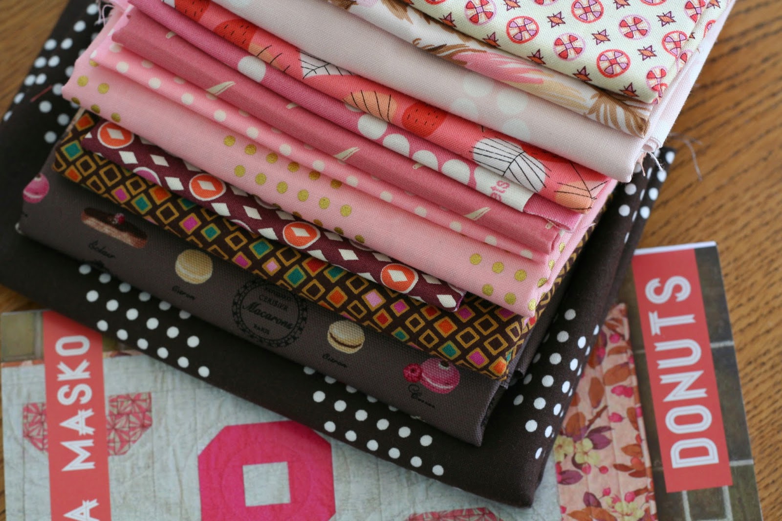 I might not be getting any sewing done but I am plotting a future quilt. Bonnie from pinkxstitches has organised a Donut Quiltalong on Instagram (#donutqal). I’ve put together this pile of possible fabrics, I chose fabrics that made me think of chocolate, berries and sprinkles. Of course, I may yet change my mind completely.