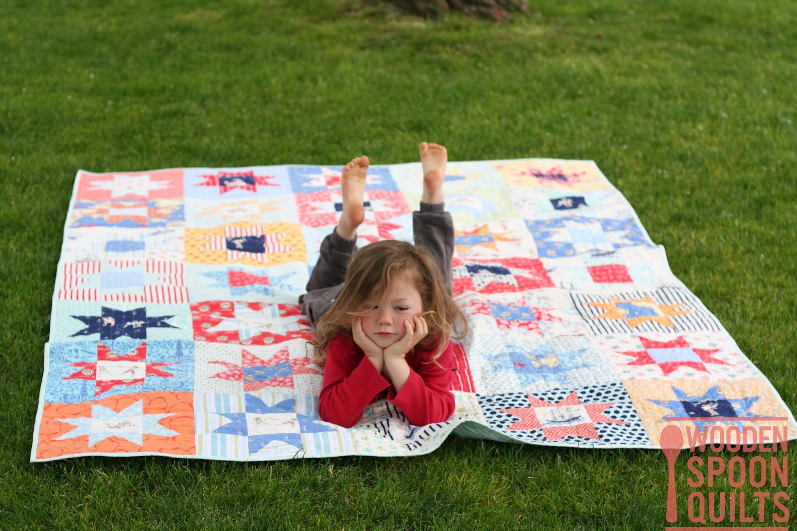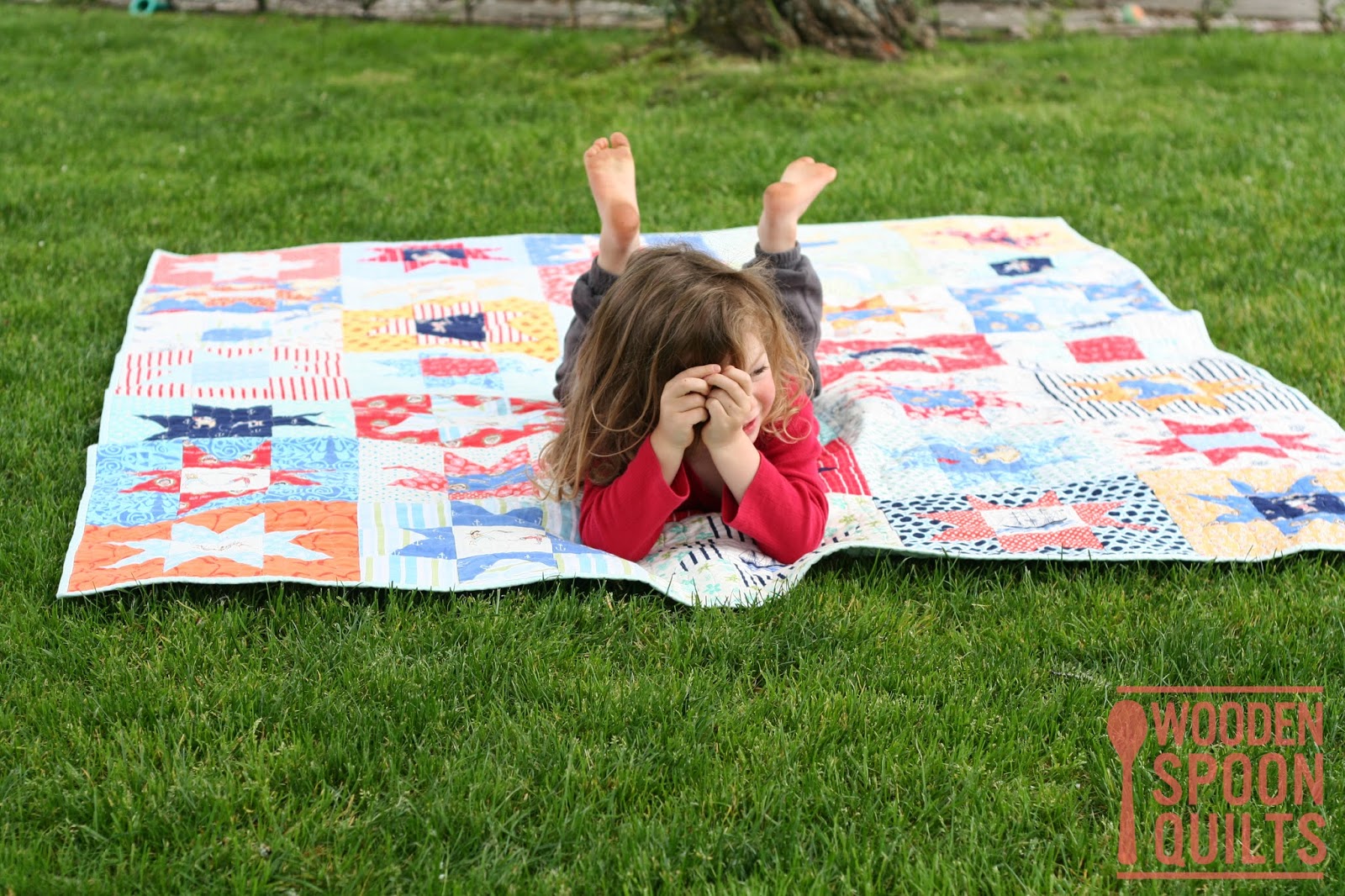 A few weeks back I dragged my small boy’s July Stars quilt off his bed and outside for a photo shoot. I finished this quilt a year ago. When I finished it, I wasn’t sure I really liked it, but seeing my small boy tucked up with it every night this last year has completely changed my mind. What was I thinking!? I love it now!