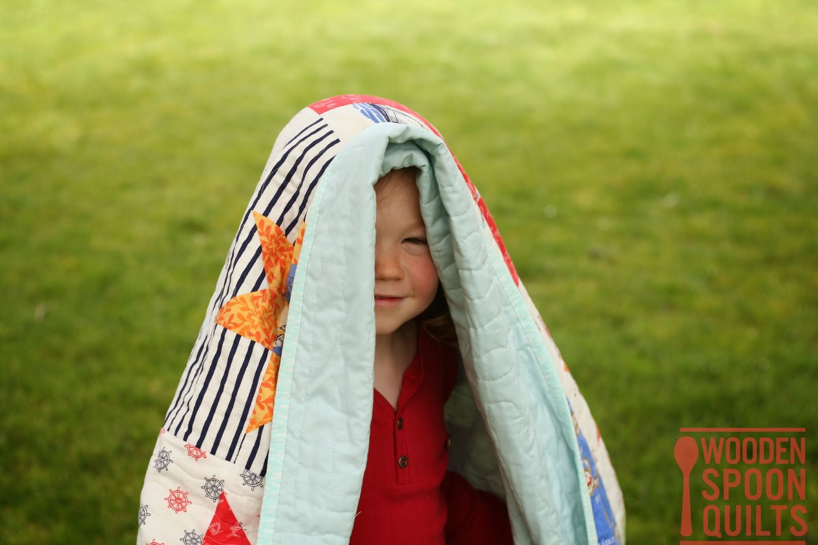 What a perfect little boy quilt! I am glad that you fell in love with it over time, I suspect you were looking through the eyes of a quilt maker who wants it to be just right! I find that I often love quilts more months after making them for the same reason. I don't look at every fabric choice and stitch and just see a lovely, colorful quilt that is wrapping up someone I love!! Your little boy is darling, the picture with the quilt around his head is precious!
