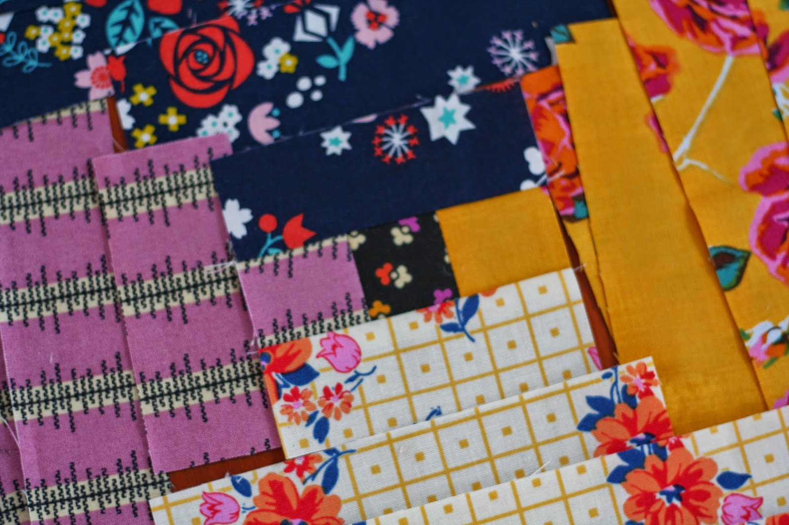 To sew these blocks, I laid the strips out on the floor, then grabbed the 5 centre pieces from each block and sewed those together. I double checked that I had the fabrics in the right order by putting the pieced square back into place. The remaining strips were then just mindless sewing. To speed things up, I chain pieced three blocks at a time.