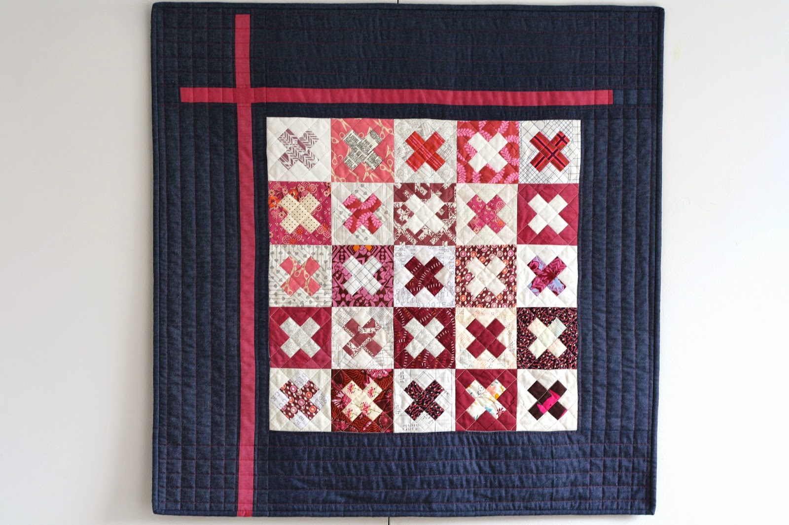 Back home, I started making some of my Raspberry Kiss blocks using low volume fabrics for the background. It quickly became obvious that I didn’t have enough fabrics to achieve the scrappy look I was after. So I raided my stash and added a few more fabrics, stretching the definition of Marsala into brown and dusty pink. To stretch my fabrics a bit further, I made blocks with Marsala fabrics as the background. Then I got stuck. I really wanted to make a throw size quilt with an improv background but I couldn’t get it to look right. With the challenge deadline fast approaching I decided to save myself a headache and keep it simple. I rediscovered a piece of denim chambray in my stash and used that to make a wide border. I had always planned to include skinny fabric strips at the top and the left. The idea was to give the impression of margin lines on a page, a page covered with kisses, just like a letter my eight year old daughter might write to me. I used an Oakshott cotton for the margin lines.