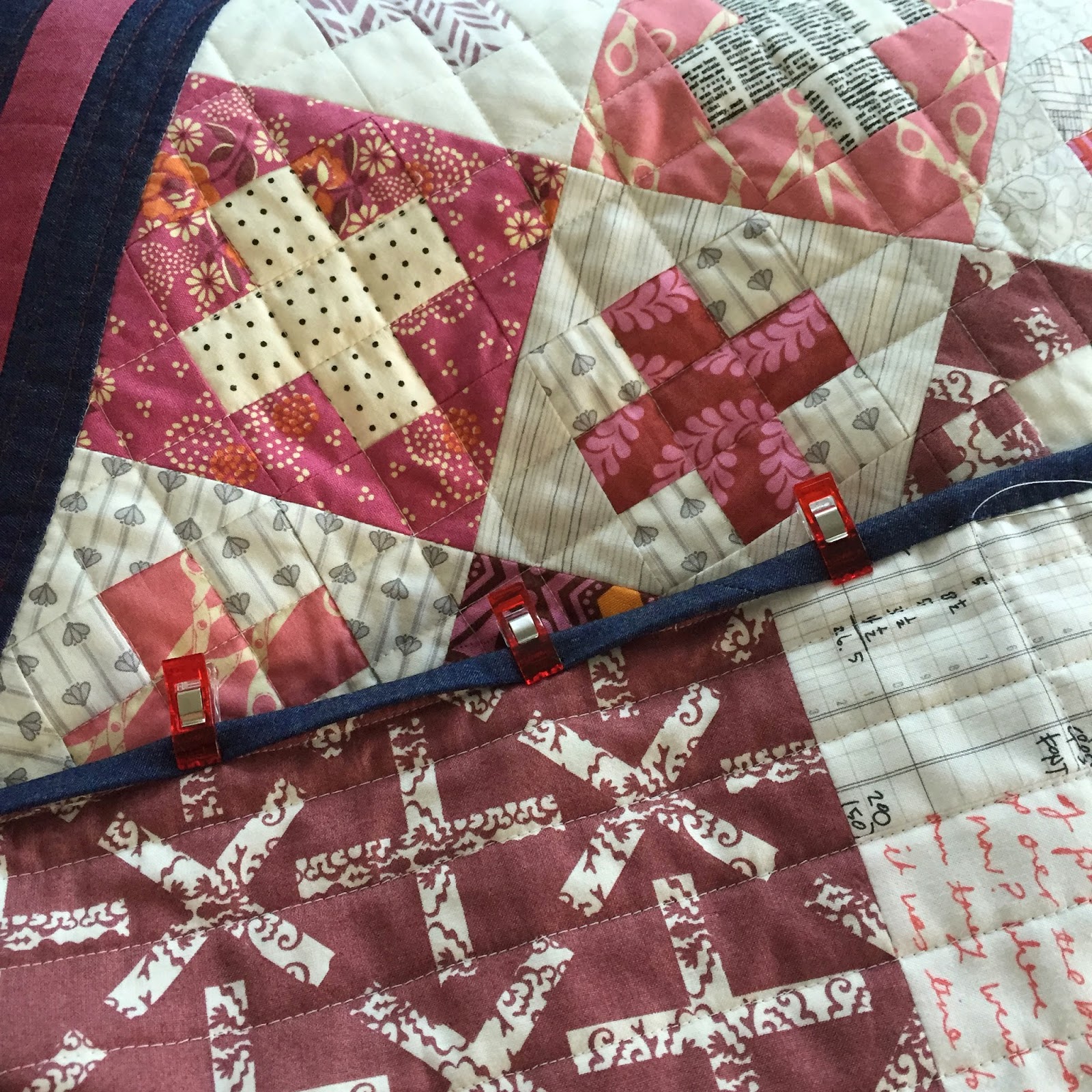I finished the quilt with simple straight line quilting, using an Aurifil Marsala-ish coloured thread on the denim. I used the denim chambray again for the binding, with just a little of the Oakshott to continue one of the margin lines right to the edge of the quilt.