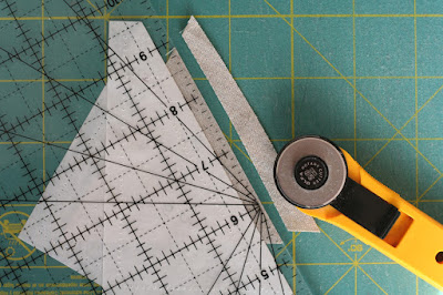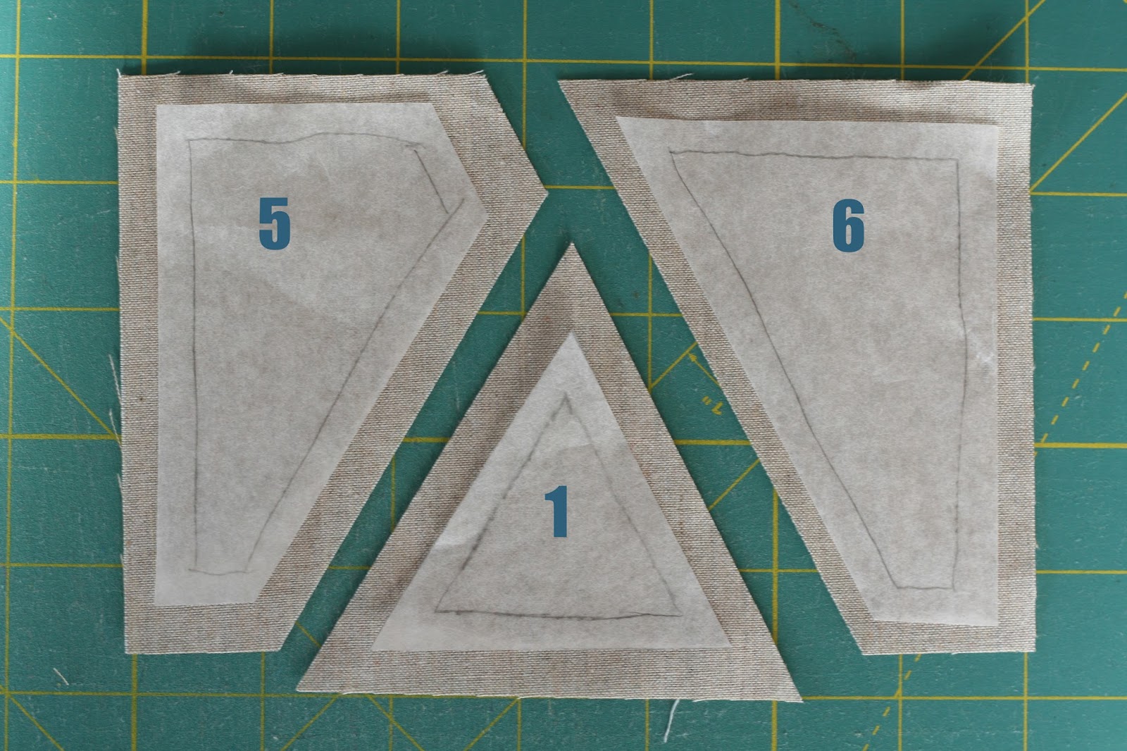 Using your rotary cutter and ruler, start with piece six.  Lay the ruler over template six at the same angle as the template, add a 1/4″ to the template edge and cut the background fabric. Remove piece six, then repeat the process for piece five. You’re then left with a triangle of fabric for piece one.