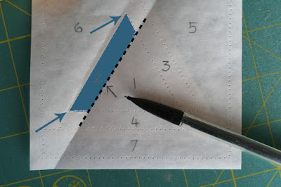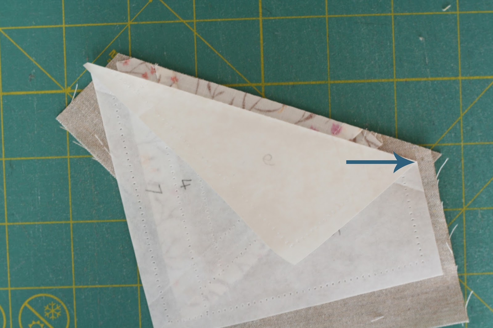 Tip for adding piece six, before sewing, make sure piece six overlaps the corner of the paper as shown by the arrow above.