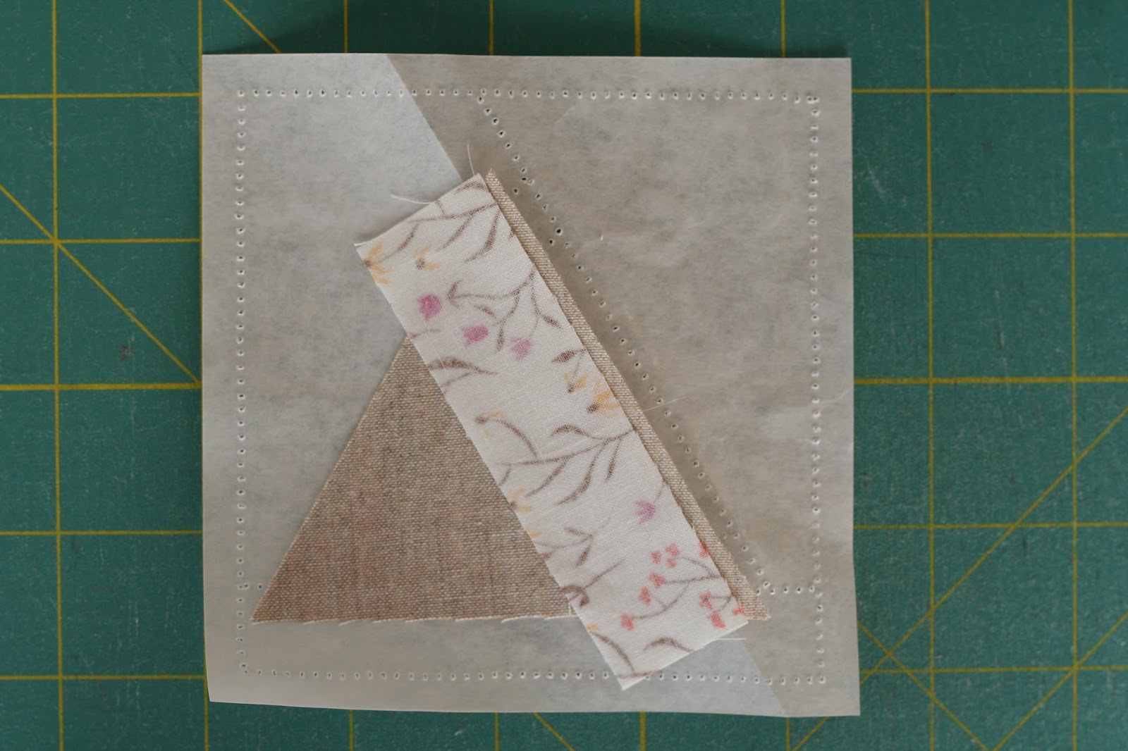 Take your fabric for piece three ( 3 1/2″ x 1″ triangle fabric). Line up with the cut edge. Sew in place as before.