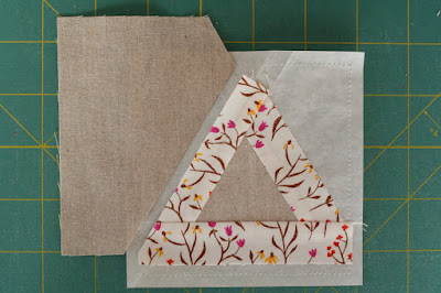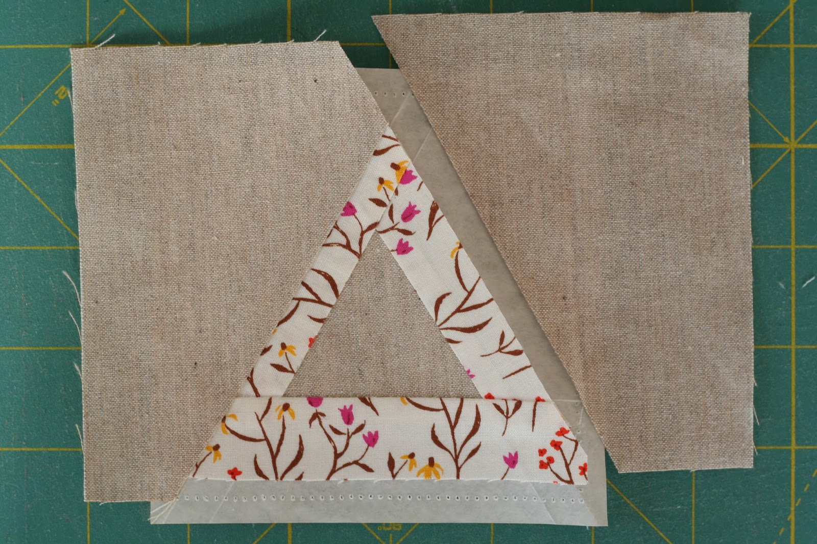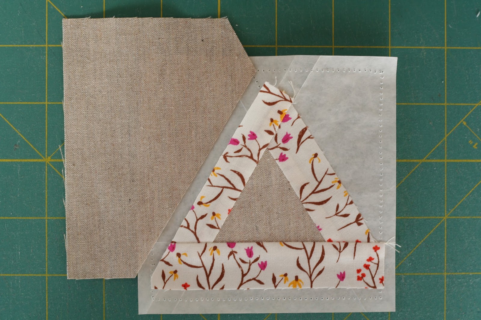 Set with an iron. Peel excess fabric back from the next seam line (where piece four will be attached). Fold the freezer paper along this seam line.
