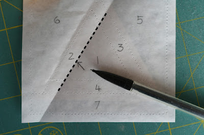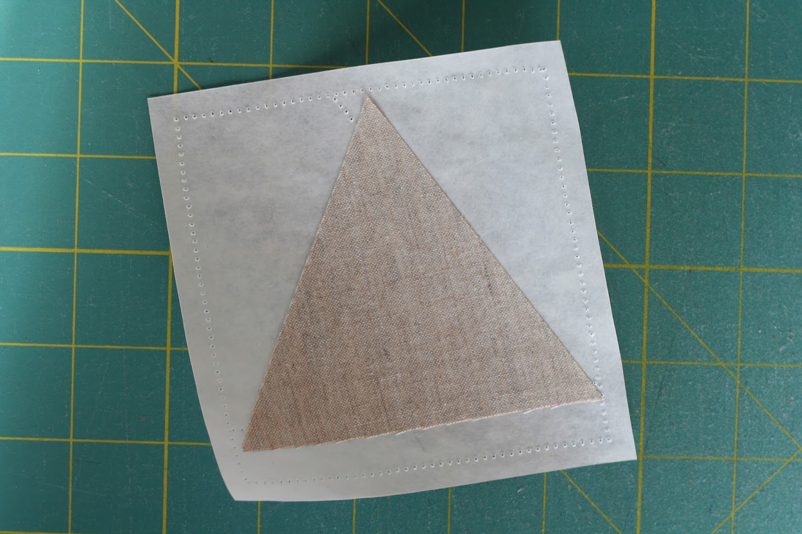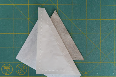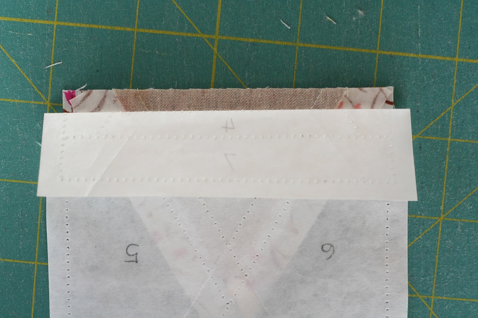 Take the template to your cutting board, gently peel a little of the fabric away from the paper along the first seam line (shown as the dashed line below).