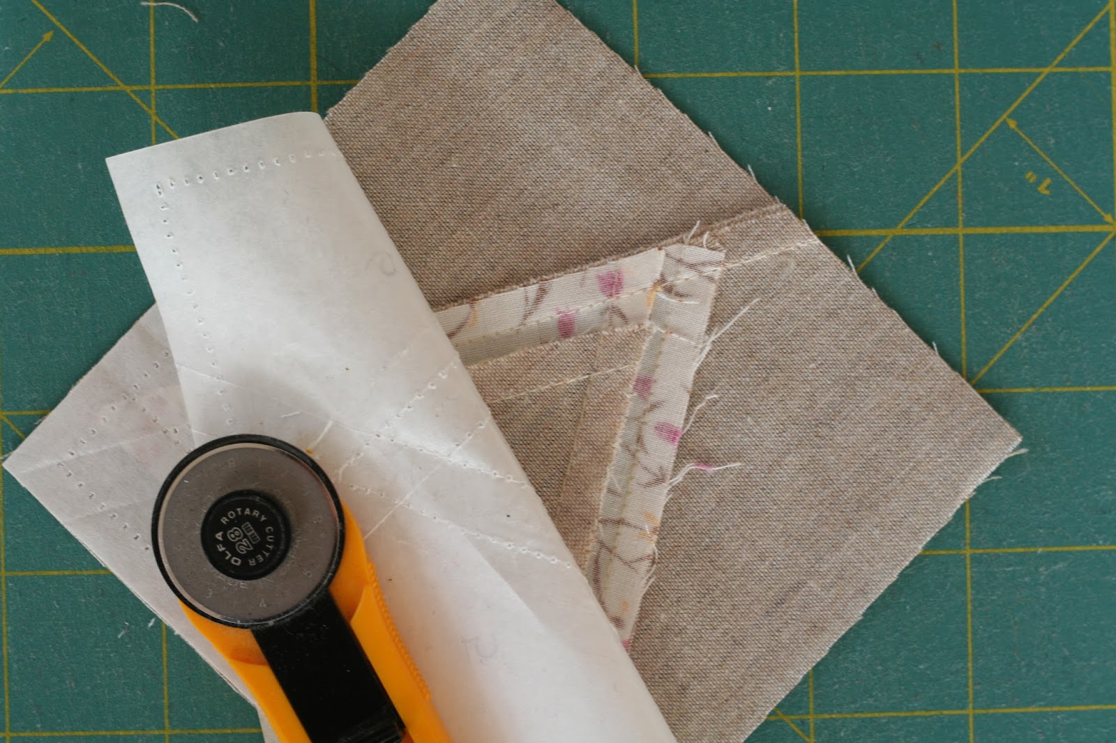 Line the 1/4″ line of your ruler up with the folded edge of the paper, trim excess fabric so that you have 1/4″ fabric overhang. You’re now ready to sew the first seam.