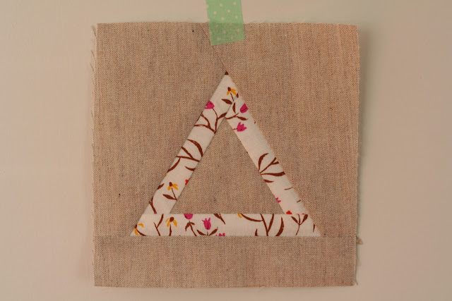 Sew piece four (4″ x 1″ triangle fabric) in place.