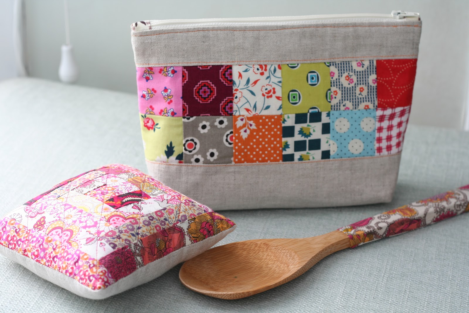 Julie made me this adorable pouch using Tessa’s new zipper pouch tutorial (featuring Denyse Schmidt fabric), a stunning Liberty log cabin pin cushion and a Liberty wrapped wooden spoon.