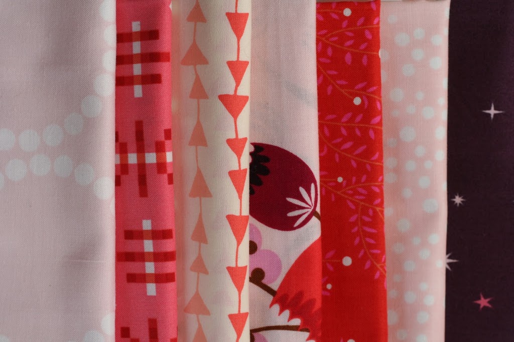 The front pocket is paper pieced, making it the perfect spot to include some favourite fabrics. I started with the Lizzy House Twinkle Twinkle fabric in burgundy for the main part of the pouch, then added coordinating prints from Lizzy House, Anna Maria Horner and Bonnie Christine.
