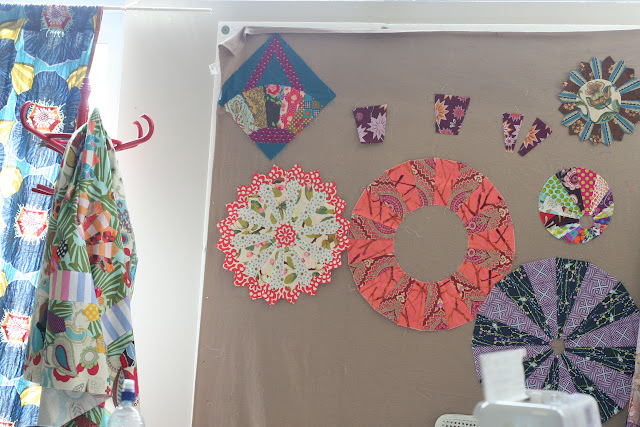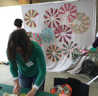 Kathy took this photo of me hard at work (haha!). The wedges on the design wall behind me are Megan’s, mine and mum’s. We’re all making Vintage Spin blocks, the pattern for which can be found in Kathy’s book ‘Adding Layers.