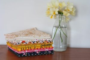 It’s a mix of all time favourite fabrics (like those Heather Ross wild flowers, the Anna Maria Horner gold floral Folk Song print, the Lizzy House mini pearl bracelets), some Japanese fabrics that I’ve long admired (including some LightHearted by Ayumi Takahashi) and two Art Gallery low volume prints, the Priory Square rose print on the top of the pile and the Maker print which is second from the top. Note; links are to the fabrics in their Etsy store where they’re still available, a couple of fabrics have since sold out.